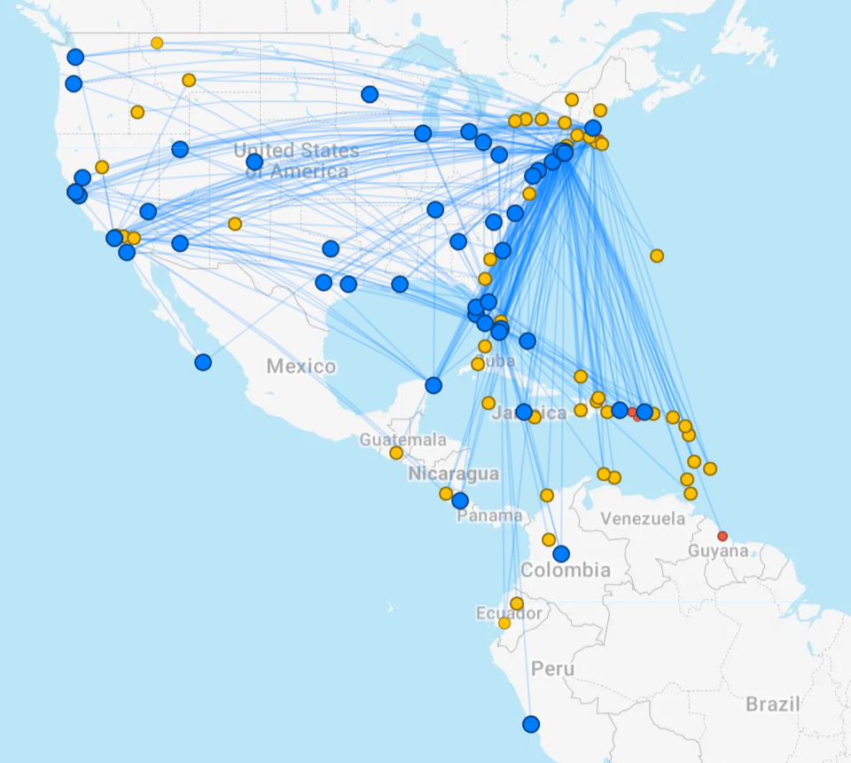 JetBlue has an extensive network across the United States and to many sun destinations in the Caribbean and Central America, as well as some flights to South America.