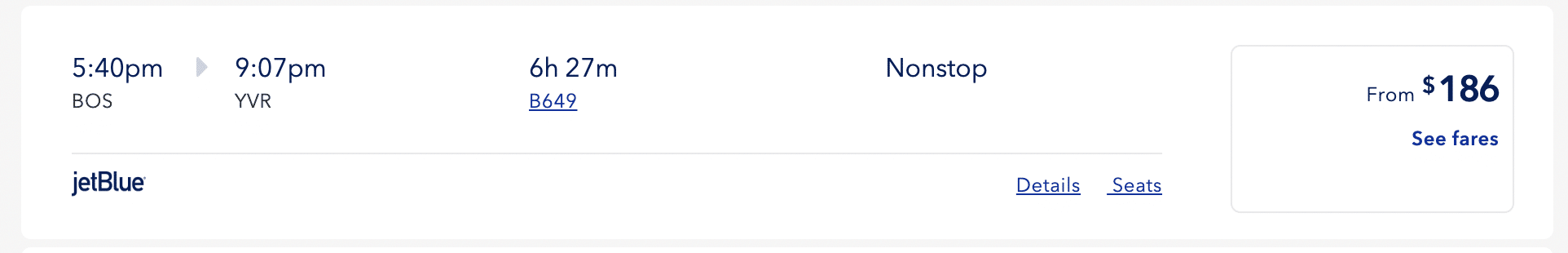 - B650 Vancouver (YVR) to Boston (BOS), departing 10:10pm and arriving 6:20am the next day