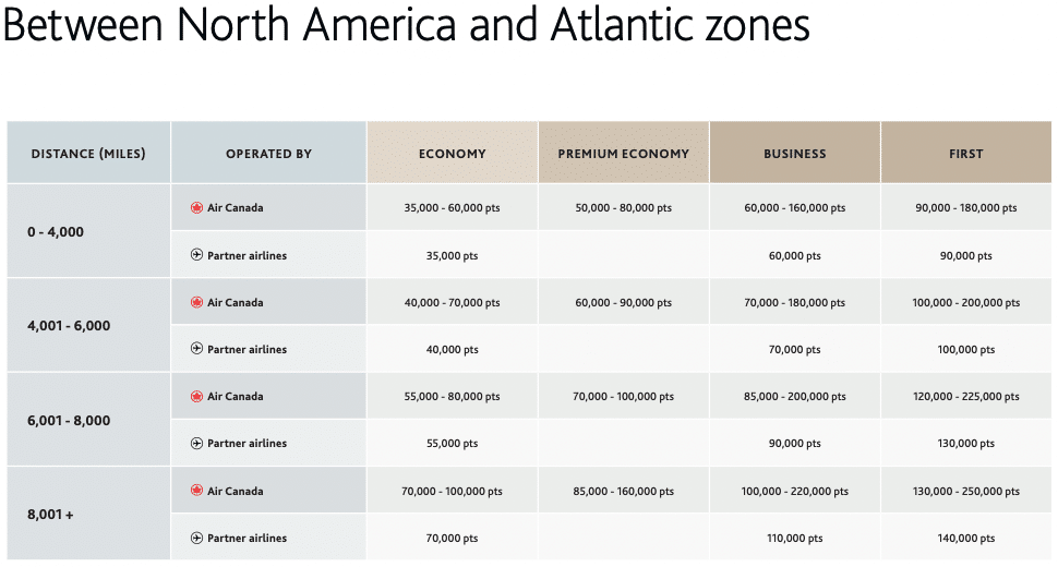 To determine the cost of a one-way flight between Munich and any Canadian city using Aeroplan, we’d need to reference the “Between North America and Atlantic zones” section on the Aeroplan Flight Reward Chart.