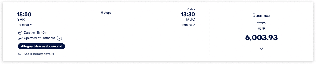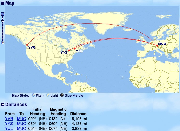 The distance between Munich and Vancouver or Toronto falls between 4,001 and 6,000 miles, according to Great Circle Mapper, which means that it’d cost 70,000 points to book a one-way flight in business class in either direction. However, the distance from Munich to Montreal measures under 4,000 miles, which means a one-way flight in business class would cost just 60,000 miles.