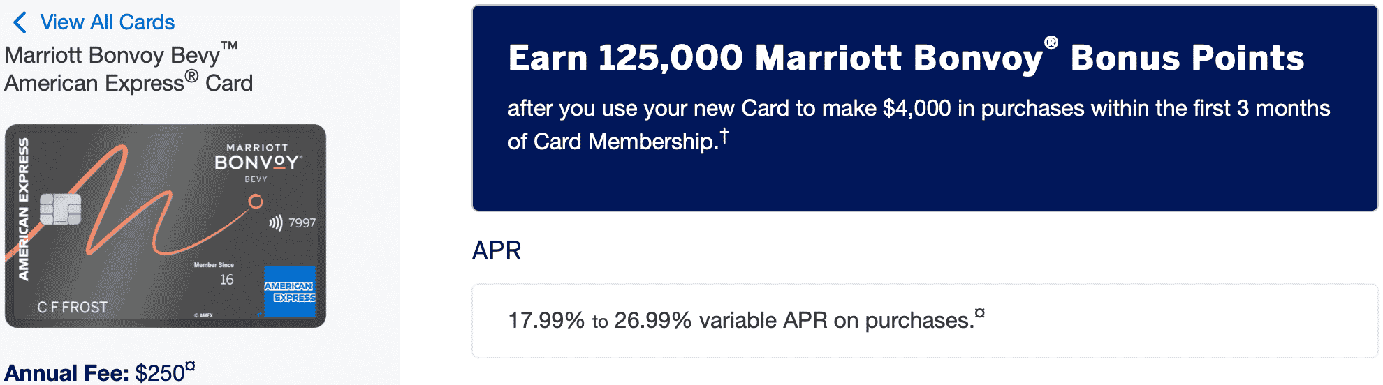 The Bonvoy Bevy earns 25,000 fewer points (125,000 points vs. 150,000 points), but requires $1,000 less in spending ($4,000 vs. $5,000) and $400 less in annual fees ($250 vs. $650).