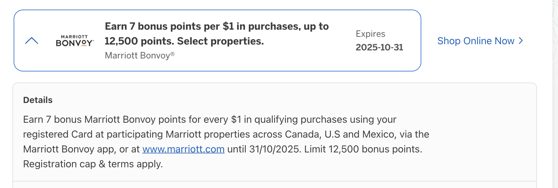Until 31/10/2025, you can earn 7 bonus Marriott Bonvoy® points for every dollar charged to your registered Card for qualifying purchases made at participating Marriott Bonvoy properties in Canada, Mexico, or the United States, via the Marriott Bonvoy mobile application, or online at www.marriott.com and subsequently posted to your account, up to 12,500 points. The number of bonus Marriott Bonvoy® points is calculated by multiplying each eligible transaction by 7, subject to rounding. In the case of a purchase made during the offer period, it may not qualify if the registered Card is charged by the merchant on a different date, and that date occurs after the offer ends.