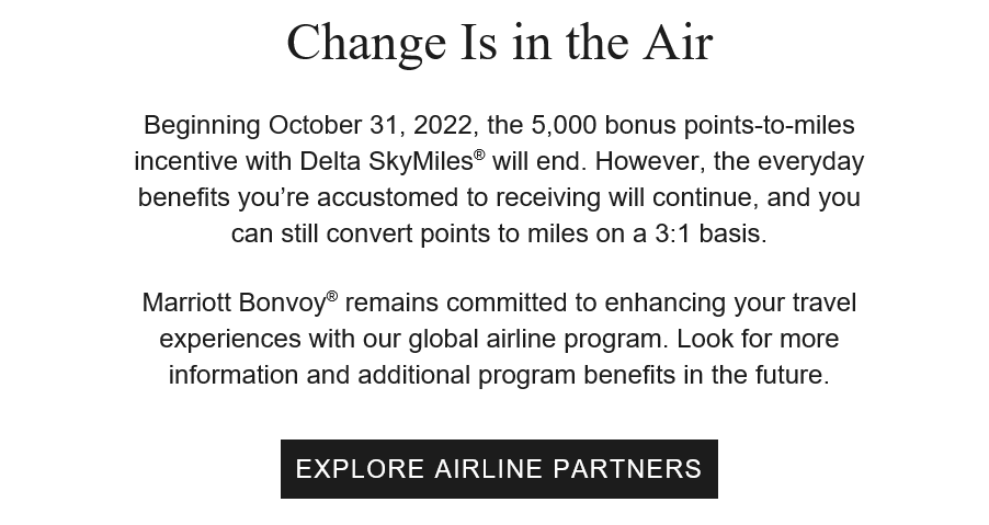 As of October 31, 2022, Marriott Bonvoy no longer provides a transfer bonus of 5,000 airline miles for mileage transfers to American Airlines AAdvantage, Avianca LifeMiles, and Delta SkyMiles.