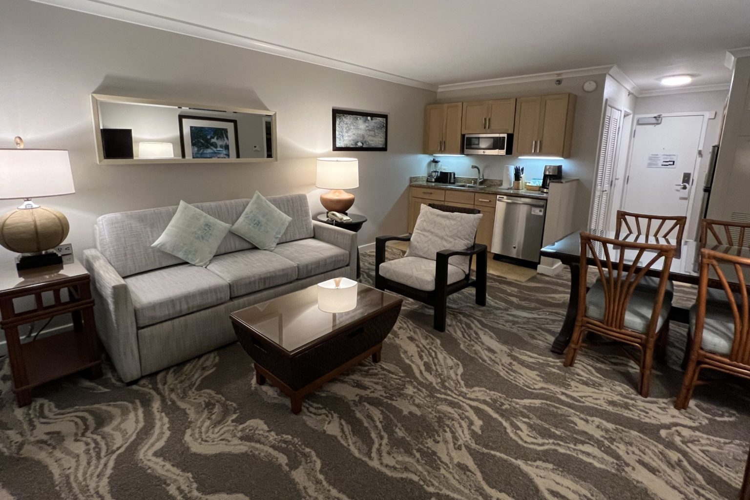 Our one-bedroom villa was really two connecting hotel rooms; one was transformed into a living room area with a sofa bed, a dining set for four, and kitchenette, and the other came with a king-sized bed and arm chair that also converted into a twin-sized bed.