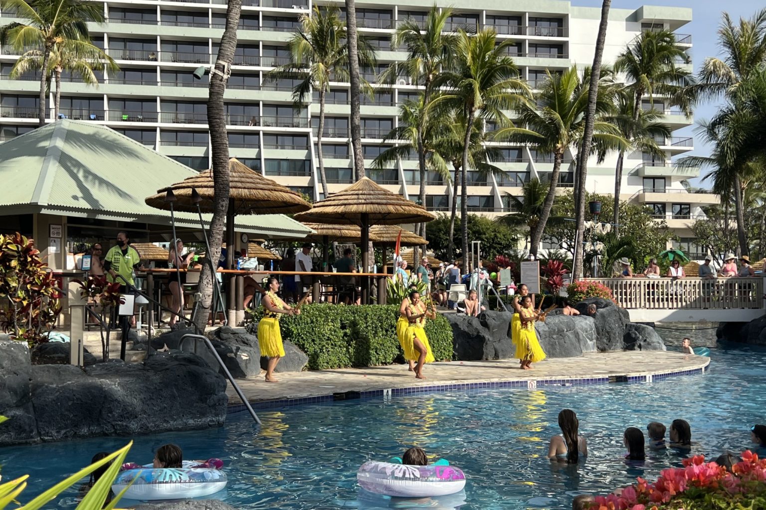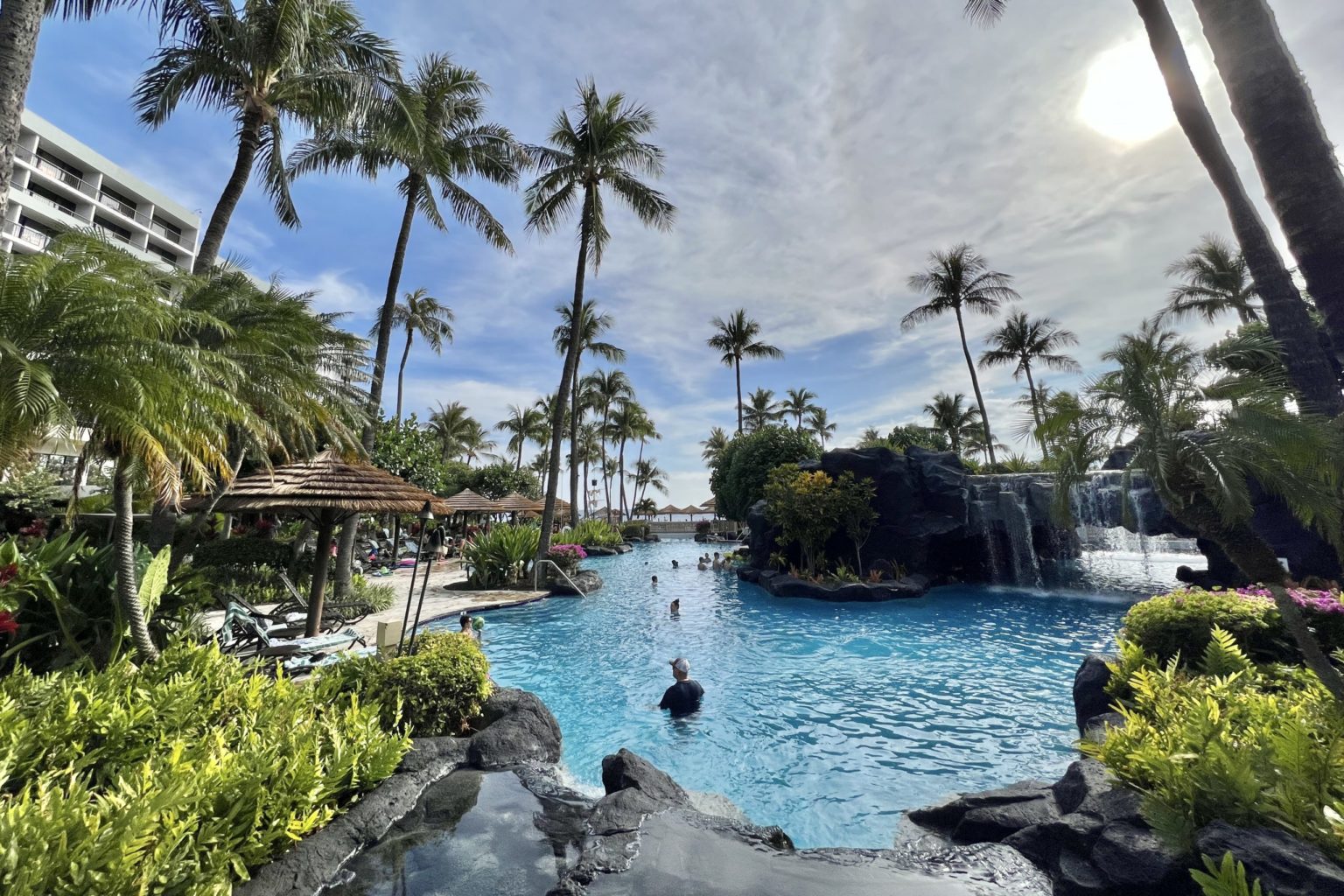 If you’re hungry, there are a few onsite venues that serve casual food, including a couple of poolside bars. Starbucks is only open till 3pm.