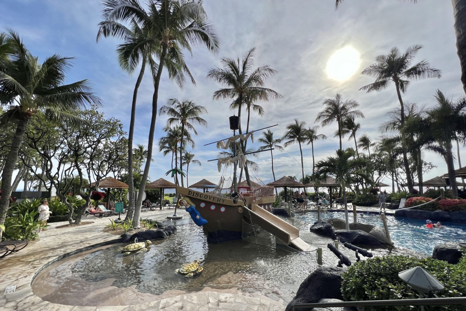 The biggest appeal of this resort is their massive pool system. It essentially is a big loop that’s tiered with a couple of hot tubs and a toddler pool with a pirate ship play area. There are also basketball and volleyball nets set up in the pool.