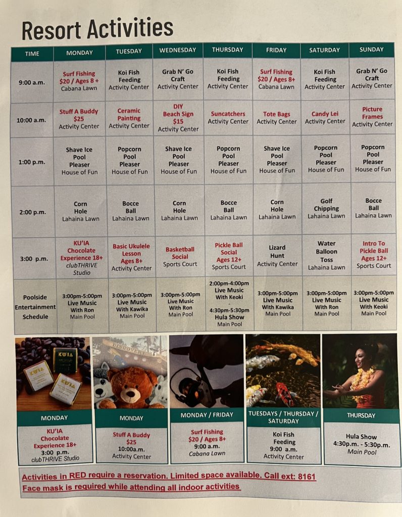 They also run other games and program throughout the day. Most activities are complimentary, but parental supervision is necessary. There is a weekly bulletin of activities.