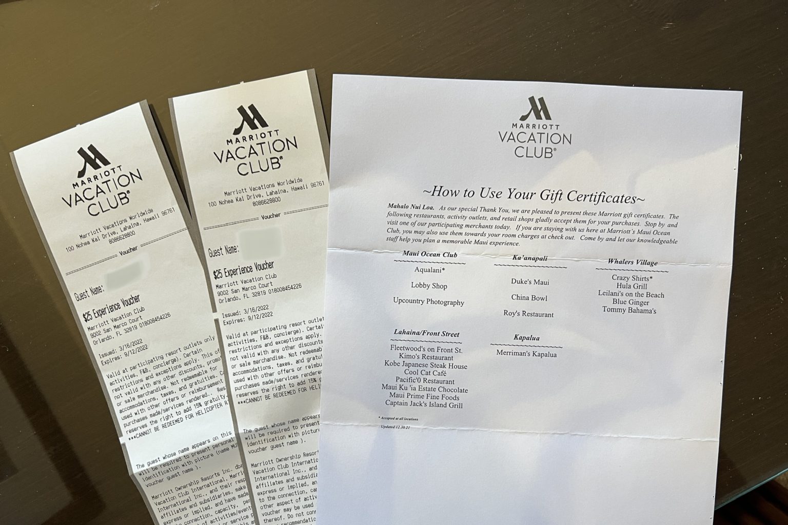 At this point, we kindly declined. I thought at that point we were done, but we were brought to yet another agent who gave us an exit interview to rate our agent and presented us with two $25 vouchers that could be used towards our current stay or at select establishments in the area. This was a pleasant surprise, as it wasn’t part of our presentation offer.