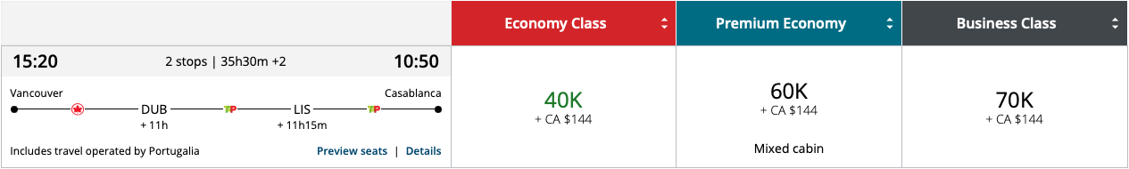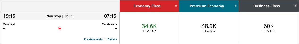 Morocco is surprisingly close to Eastern Canada in geographical terms. Direct flights such as Montreal–Casablanca cost just 60,000 Aeroplan points in business class one-way.