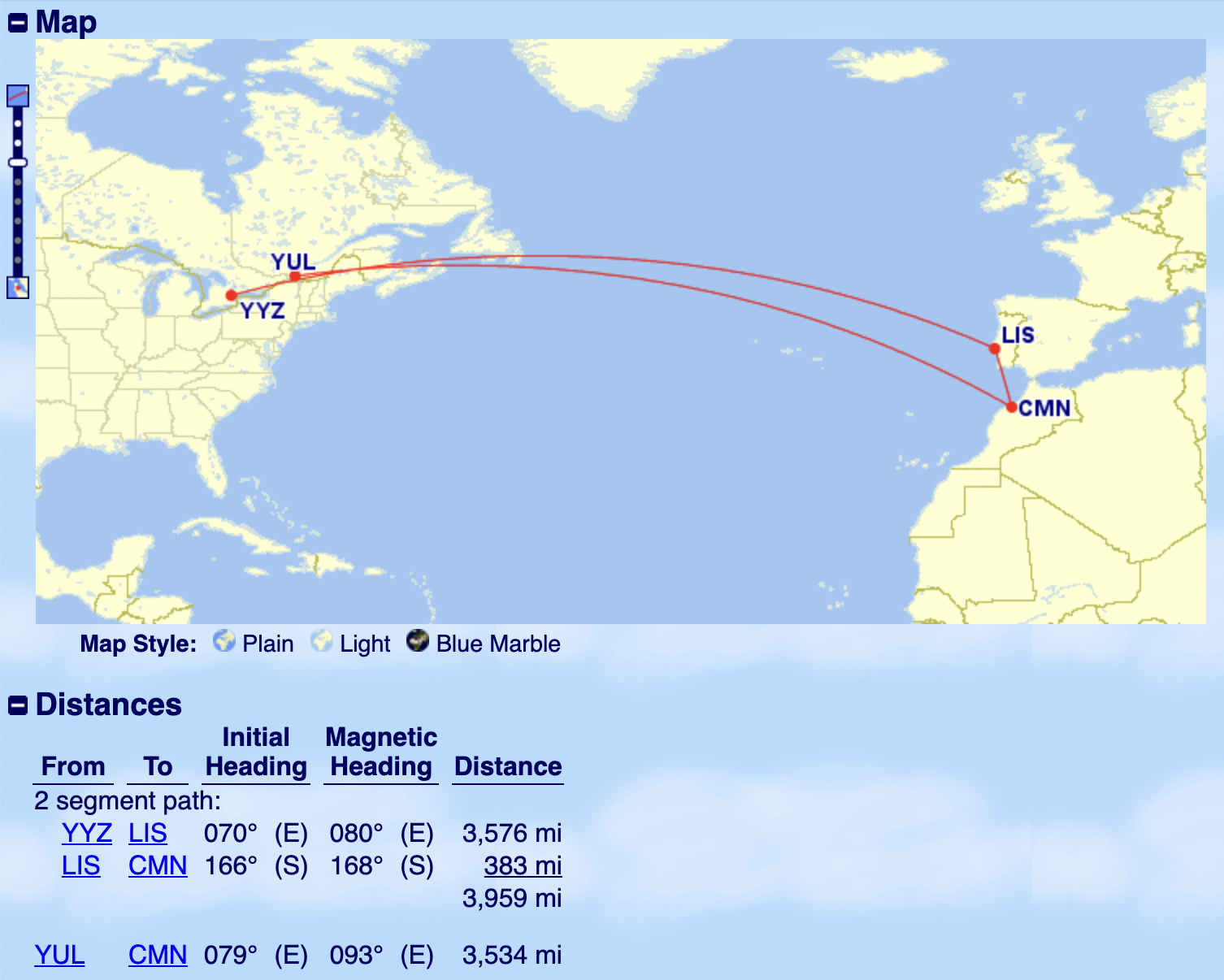 From Toronto, you can squeeze in just under the 4,000-mile threshold on the “Between North America and Atlantic zone” chart with a connection in Lisbon, also for 60,000 Aeroplan points.