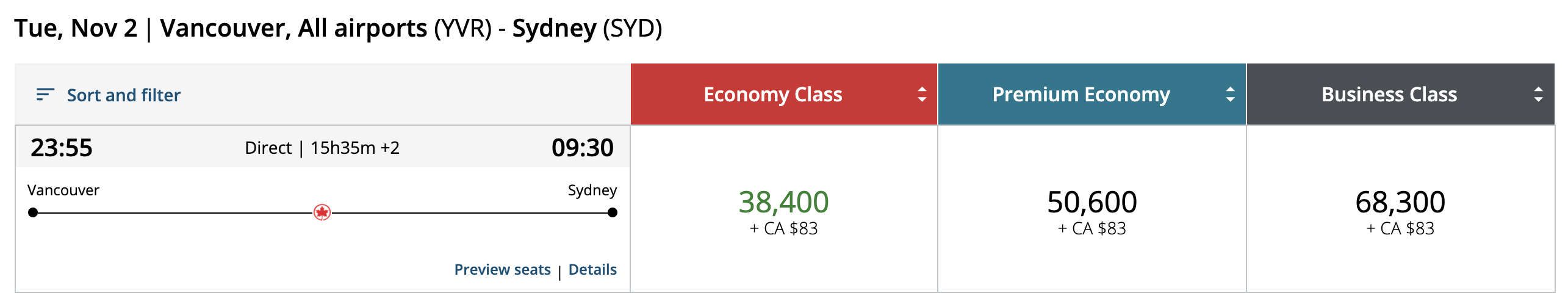 - However, this does not hold true across the board: in the Vancouver–Sydney examples, the base-level discount is only around 8,000 points off a total of 583,200 points – a measly 1.4%. Having said that, the Vancouver–Sydney route seems to be pricing anomalously as a whole, so maybe we’ll wait and see if any kinks need to be ironed out here.