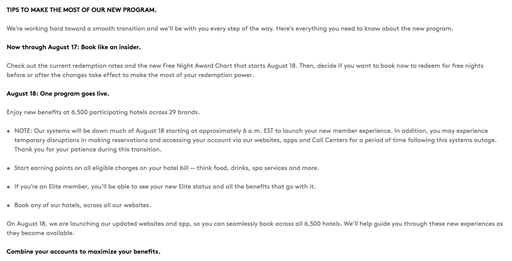 All of the updates to elite status, earning & redeeming, and hotel categories will therefore take effect after 6am EST on this date. Your SPG and Marriott points balances, elite nights, and lifetime totals will all be merged, and your points will be redeemable at all 6,500+ properties under the umbrella from this point onwards.
