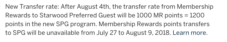 The ability to transfer Membership Rewards to SPG will be shut down between July 27 and August 9 while Amex prepares its back-end for the new transfer scheme in place. Therefore, if you want to pre-emptively transfer Membership Rewards points to the new program under the current regime, the time remaining for you to do so is a matter of days.