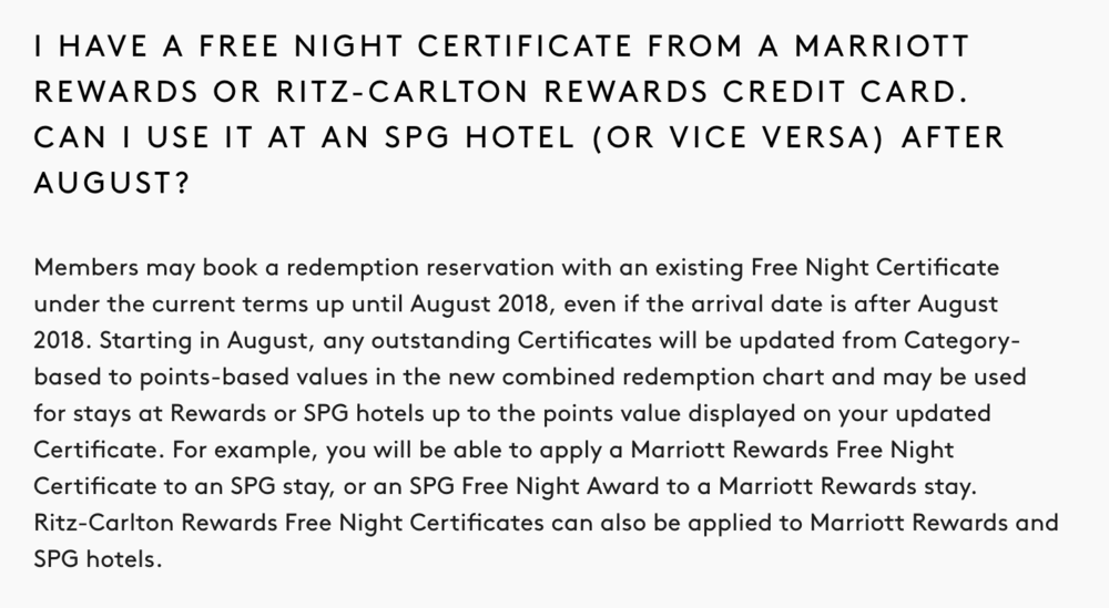 Many of you will have earned free night certificates under Marriott Rewards or Starwood Preferred Guest. For example, Marriott Travel Packages give you 7-night certificates at hotels of a certain category, and the recent closure of the Chase Marriott Visas gave all cardholders a free night at a hotel of up to Category 5. How will these free night certificates be handled upon the switch to the new program, given that the entire hotel categories structure is experiencing a shakeup?