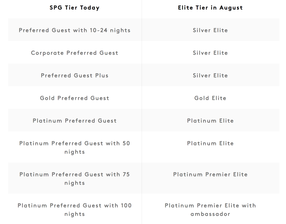 However, Marriott has since moved to clarify that the status you earn in the new program will depend on whether you earned your original status from SPG or from Marriott Rewards. In other words, the status-matching that currently takes place will not be taken in to account, and SPG Gold Elite members who earned their status as a result of being Amex cardholders will only be matched to Gold Elite under the new program. Indeed, a separate chart shows the mapping between current SPG members and the new elite tiers: