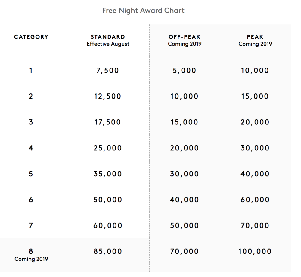 We know that the new award chart will debut in August without Category 8 or peak/off-peak pricing. Category 8 and peak/off-peak pricing will come into effect in February 2019. This implies that all hotels, even the most high-end ones, will be at most Category 7 come August – and will therefore cost at most 60,000 points.