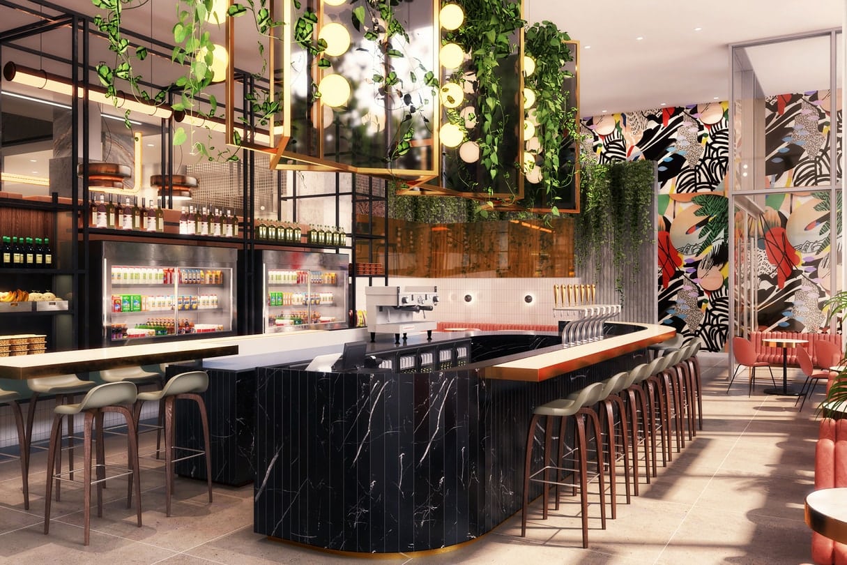 The W opens with three main dining venues: Public School Coffeehouse + Kitchen + Bar, Living Room, and Skylight.