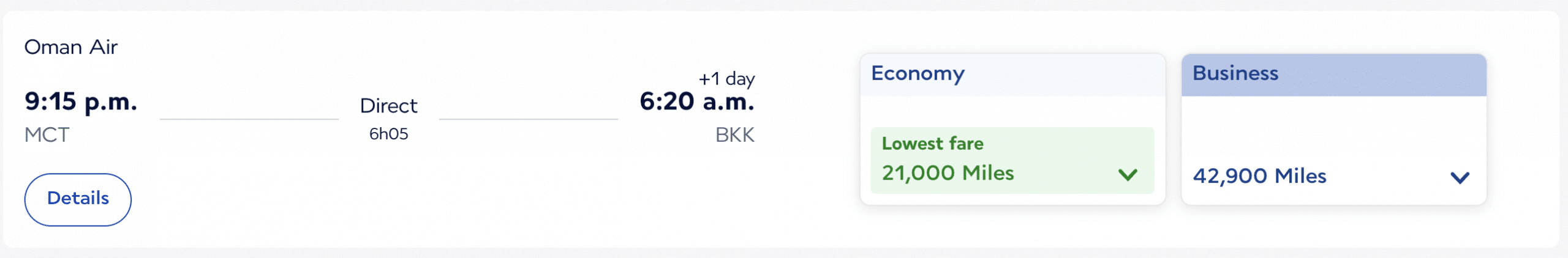 - Muscat–Bangkok: 21,000 miles plus $85 (CAD) in economy, or 42,900 miles plus $165 (CAD) in business class