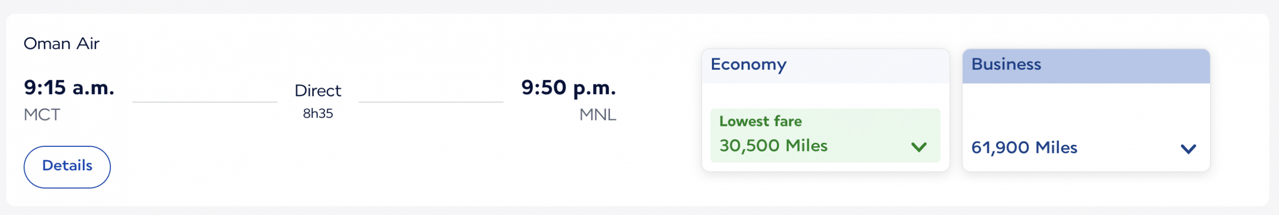 - Muscat–Manila: 30,500 miles plus $76 (CAD) in economy, or 61,900 miles plus $156 (CAD) in business class