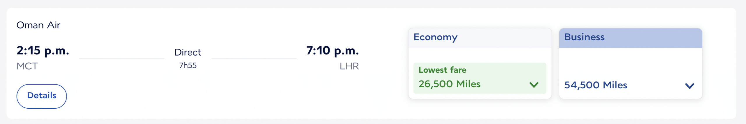 - Muscat–London: 26,500 miles plus $189 (CAD) in economy, or 61,900 miles plus $269 (CAD) in business class