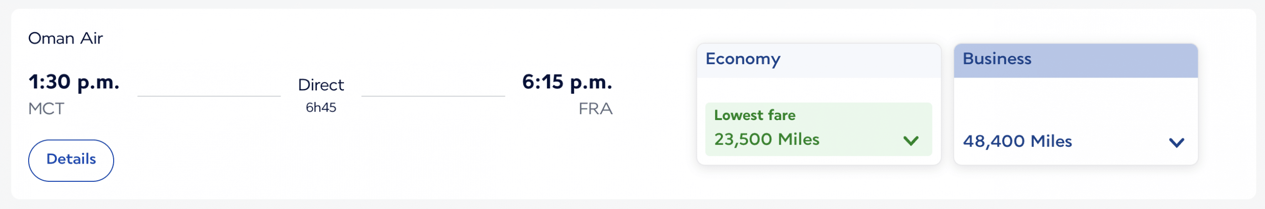 For example, the same Muscat–Frankfurt flight that costs 23,500 miles or 48,400 miles in economy or business class with Flying Blue costs 25,000 points or 45,000 points, respectively, with Aeroplan. However, the taxes and fees on Oman Air flights booked with Aeroplan are much lower.