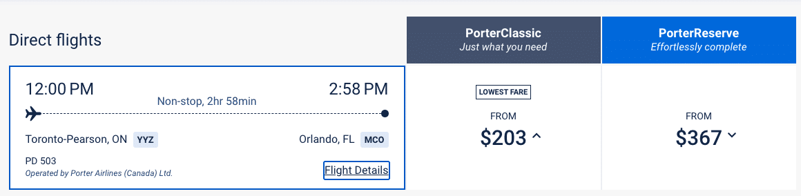 - PD503 Toronto Pearson (YYZ) to Orlando (MCO), departing 12pm and arriving 2:58pm