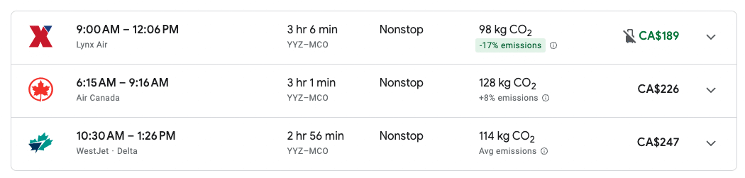 For example, a one-way flight from Toronto Pearson (YYZ) to Orlando (MCO) in mid-March is pricing out at $203 (CAD) for the lowest fare.