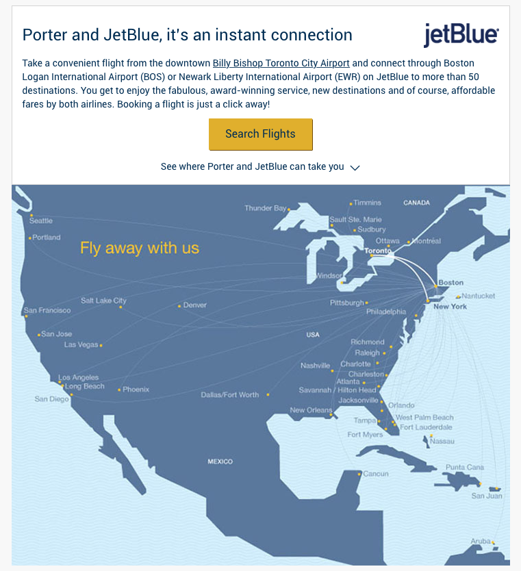 Porter has a joint venture with JetBlue to offer flights to the US, connecting through Boston (BOS) and Newark (EWR). Such itineraries are available on the Porter website.