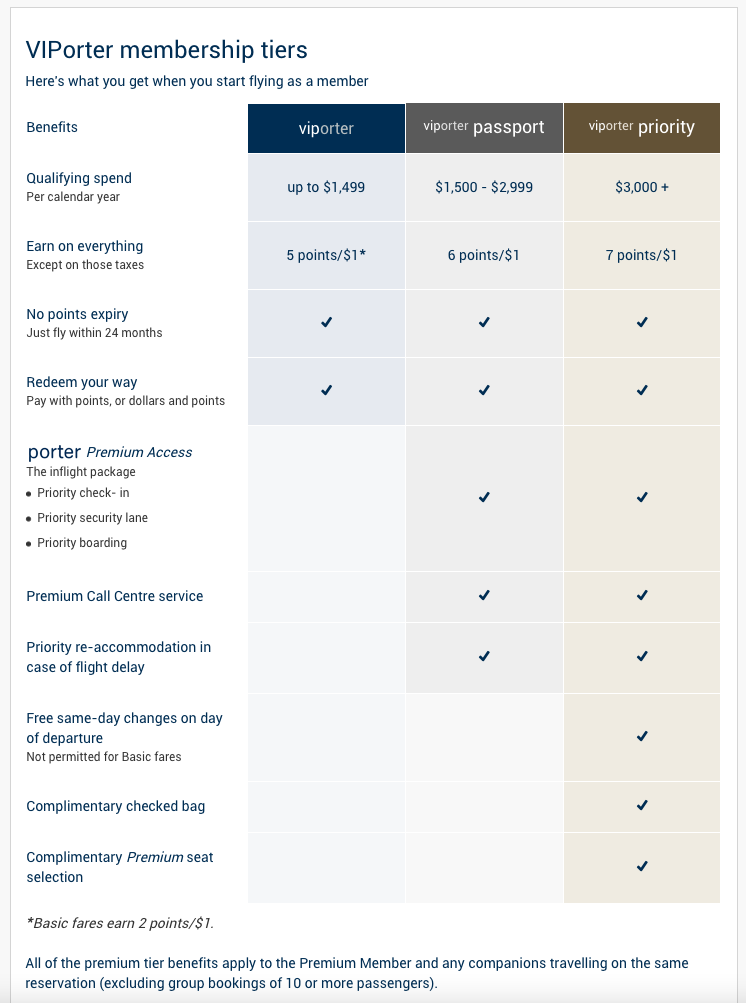 Porter’s loyalty program, VIPorter, awards customers at a fixed earning rate, depending on their elite status. The airline publishes the benefits and earnings chart on their website.