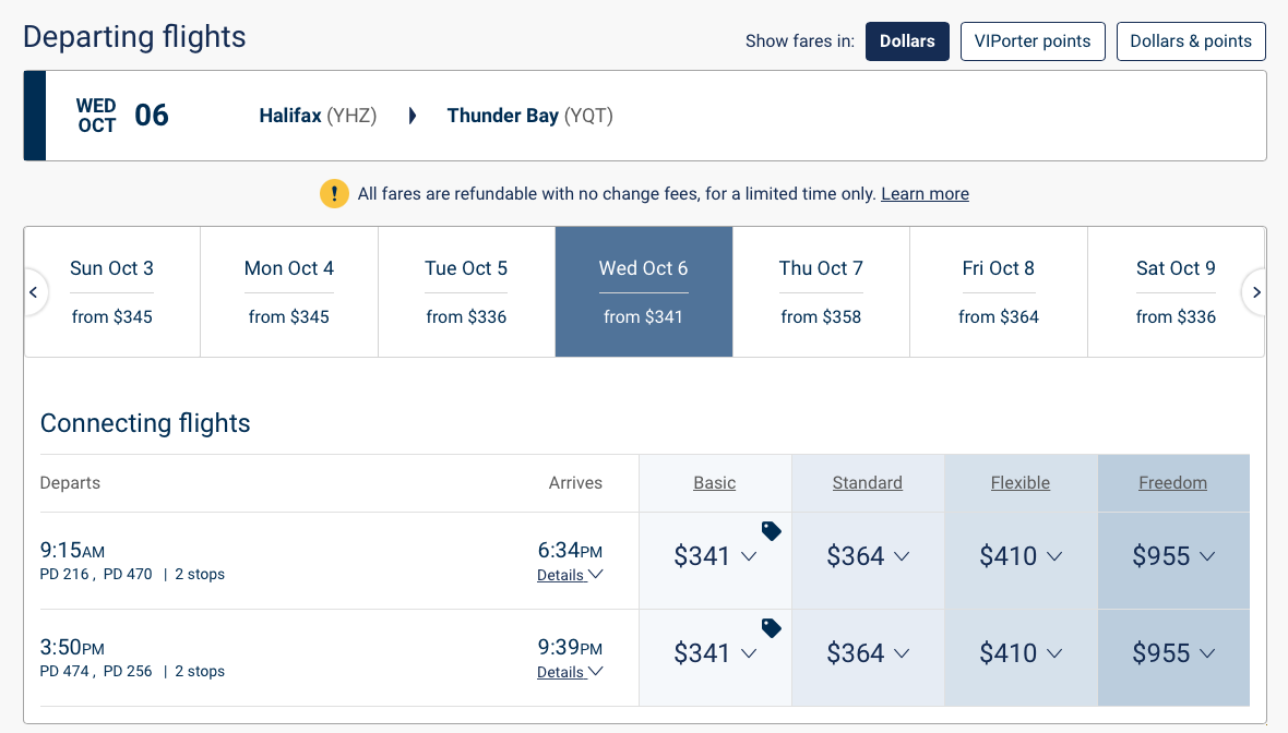 For example, a flight from Montreal to Halifax on October 6, 2021 is 9,500 VIPorter points + $75, while the Standard cash fare is $237. A trip from Halifax to Thunder Bay, ON clocks at 11,000 VIPorter points + $73, providing slightly better value compared to the revenue cost of $364.