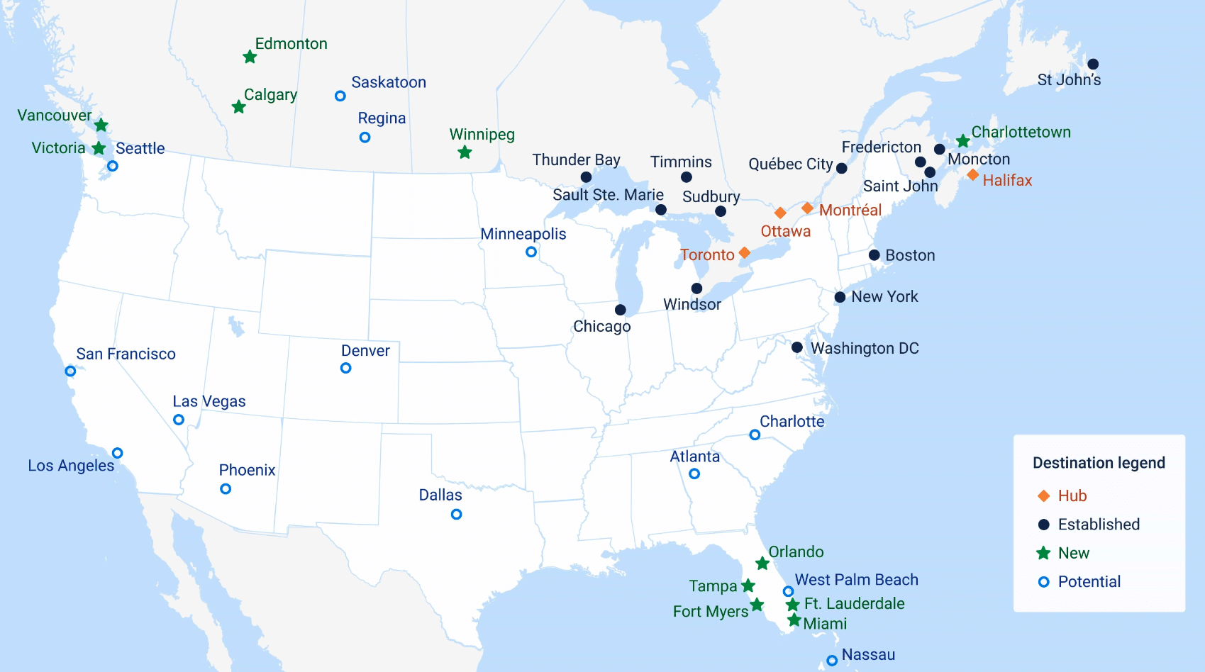 This would leave Saskatoon and Regina as the remaining Canadian destinations to which the airline may launch flights, as well as Las Vegas, Phoenix, Denver, Dallas, Atlanta, Charlotte, and West Palm Beach in the United States, and Nassau in the Bahamas.