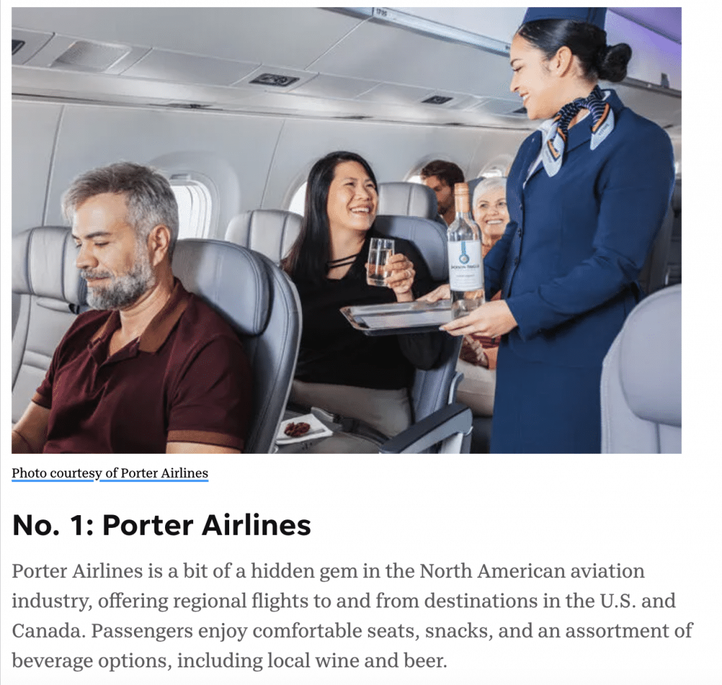 It appears the free perks Porter Airlines gives all passengers have caught the eye of travellers south of the border, as the 2024 USA Today Readers’ Choice Awards ranked Porter #1 in the world for their economy class.