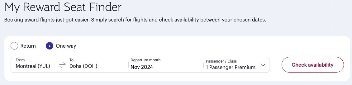 The process is quite simple. Head to the Qatar Airways website, input your origin, destination, desired month of departure, class of service, and number of passengers, then click “Check availability.”