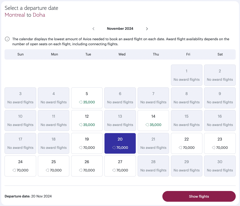 A calendar will appear displaying the lowest cost of award availability first, and if you’re happy with the price and date, you can click and book.