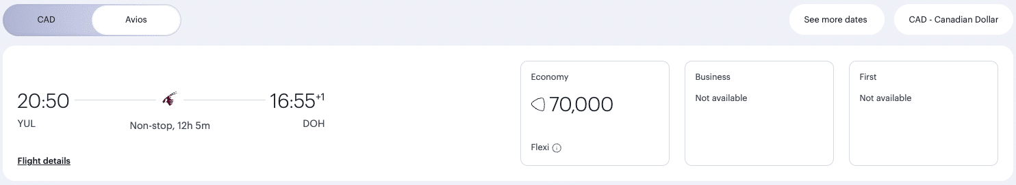 Qatar Airways offers two types of awards: “Classic” (otherwise known as “Saver”) and “Flexi.” Classic awards are the lowest-priced but often hardest to find for Qatar Airways flights, while Flexi awards are far easier to come by but will cost you twice as much.