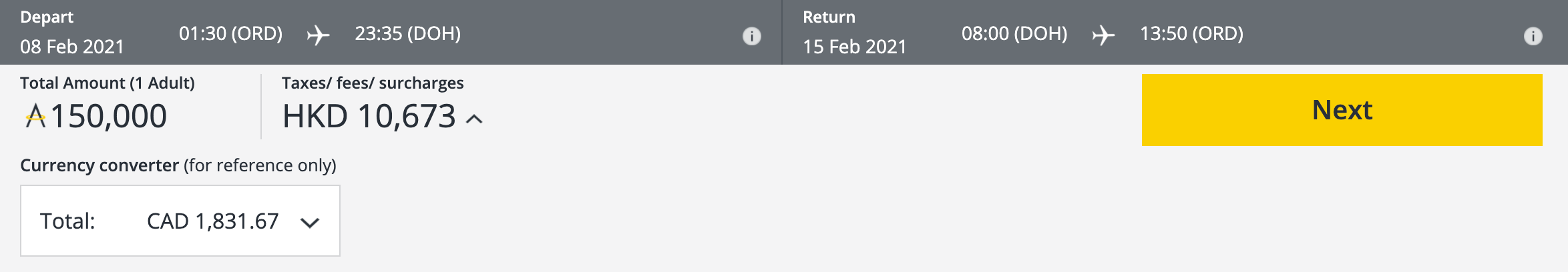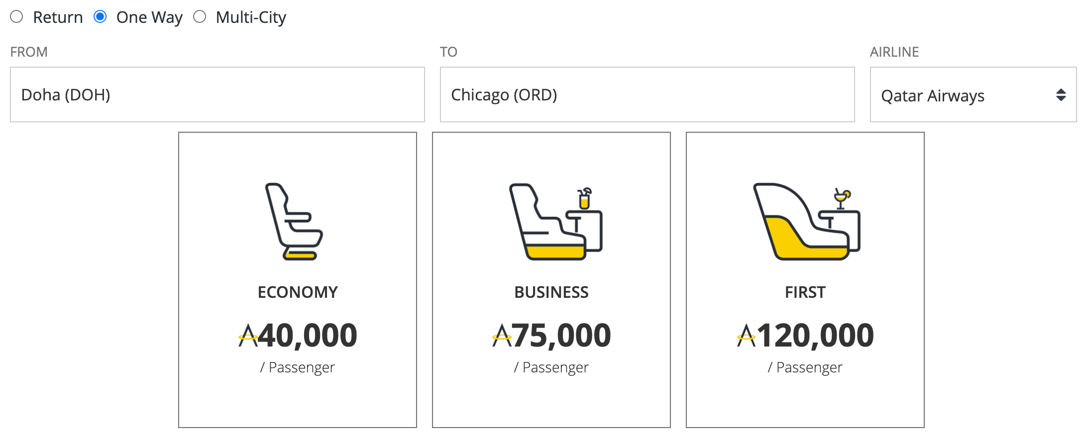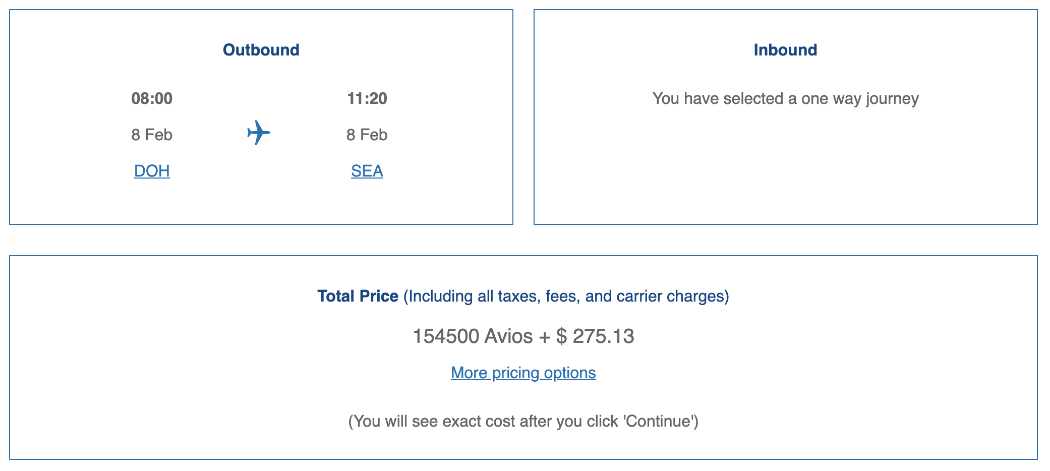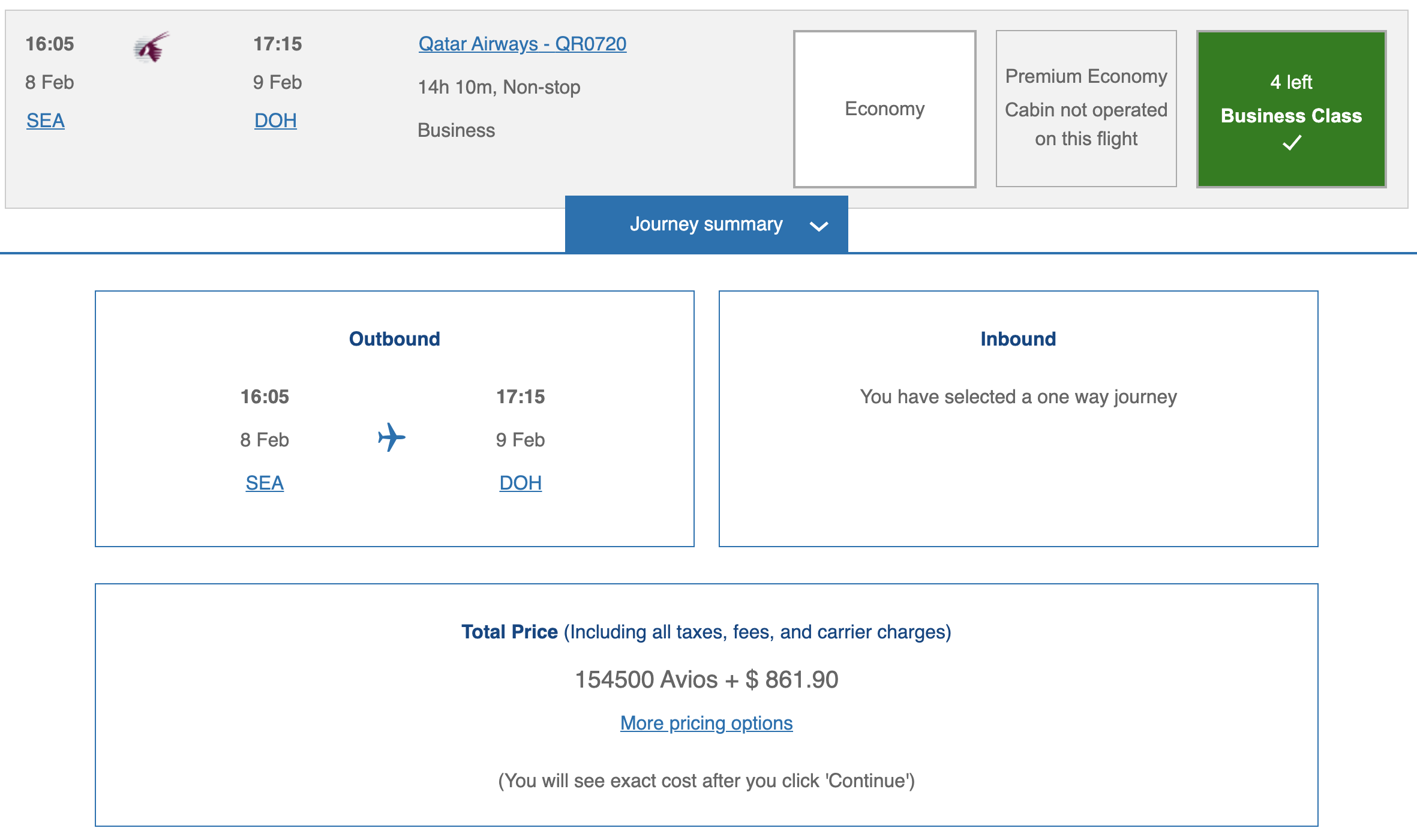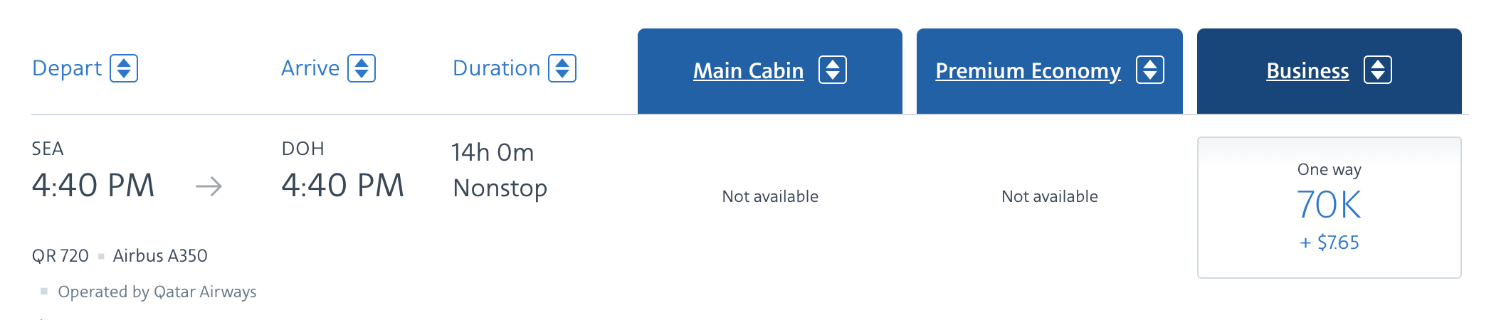 While the Seattle route hasn’t been loaded into their search engine yet, we can estimate prices based on the Doha–Chicago route, which falls into the same distance band of 5,001–7,500 miles.