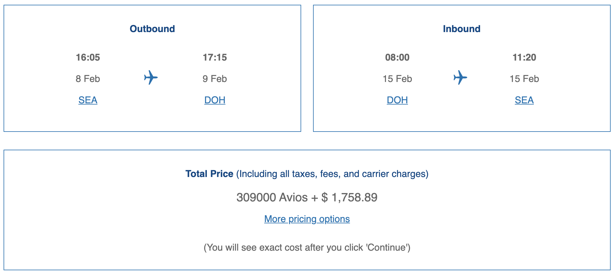 However, Avios can be challenging to redeem for good value, even on direct flights, because of their distance-based partner award chart. At approximately 7,400 miles, Doha-Seattle lands in Zone 9, the highest tier for flights over 7,000 miles: