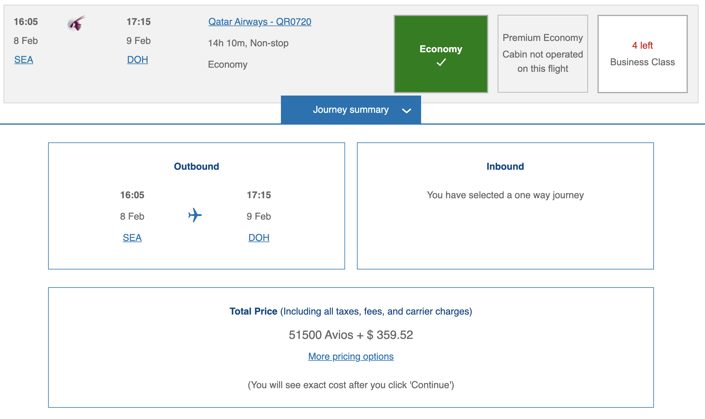 - QR720 Seattle to Doha, departing 4:05pm and arriving 5:15pm the next day
