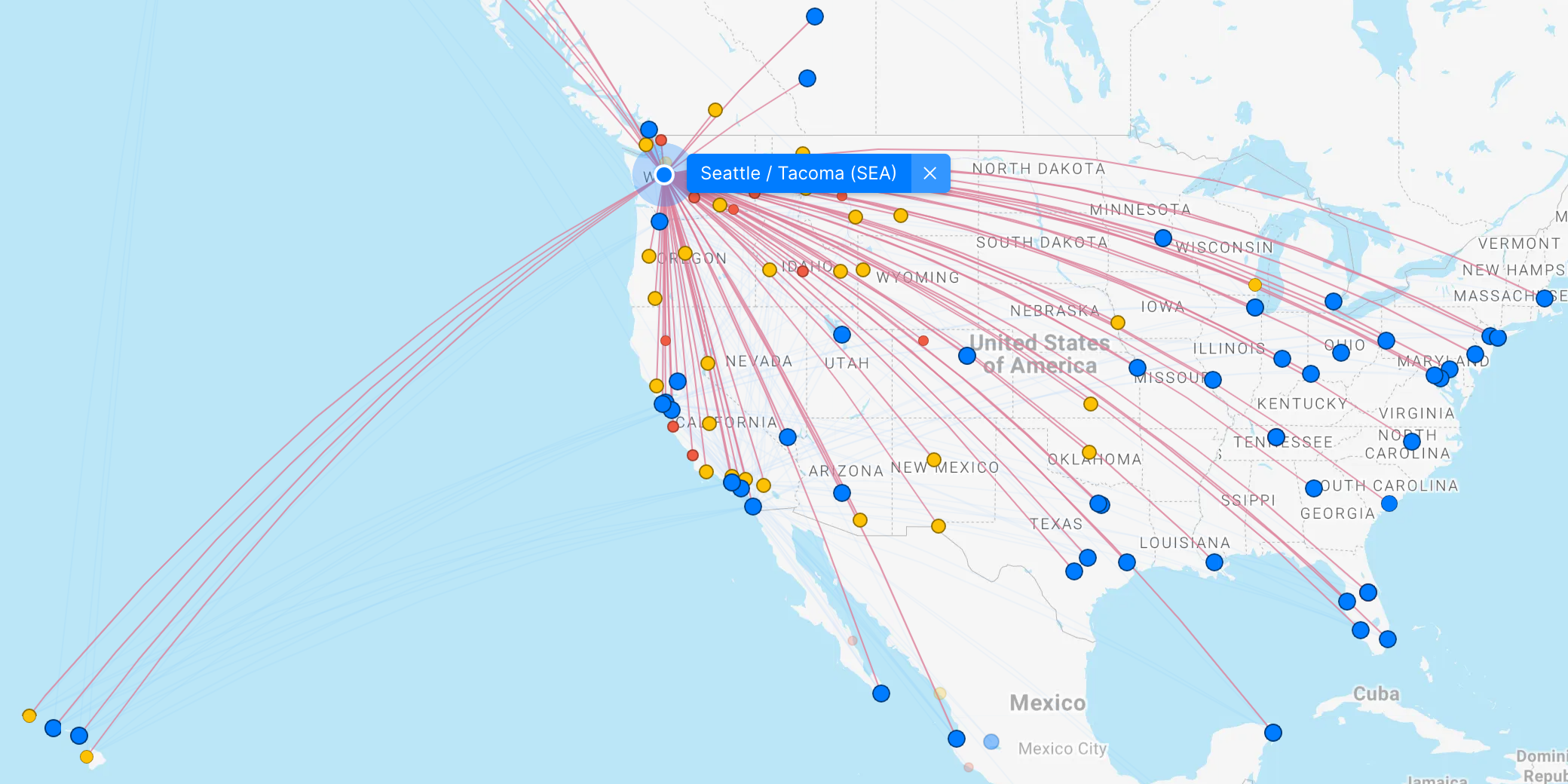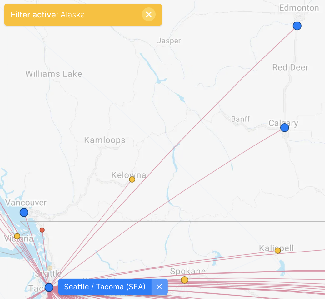 Pretty much anywhere in the US that you can fly to from Seattle, Alaska flies that route. Some new “nearly direct” destinations from Western Canada might include New Orleans, Charleston, San Antonio, Fort Myers, and Albuquerque.