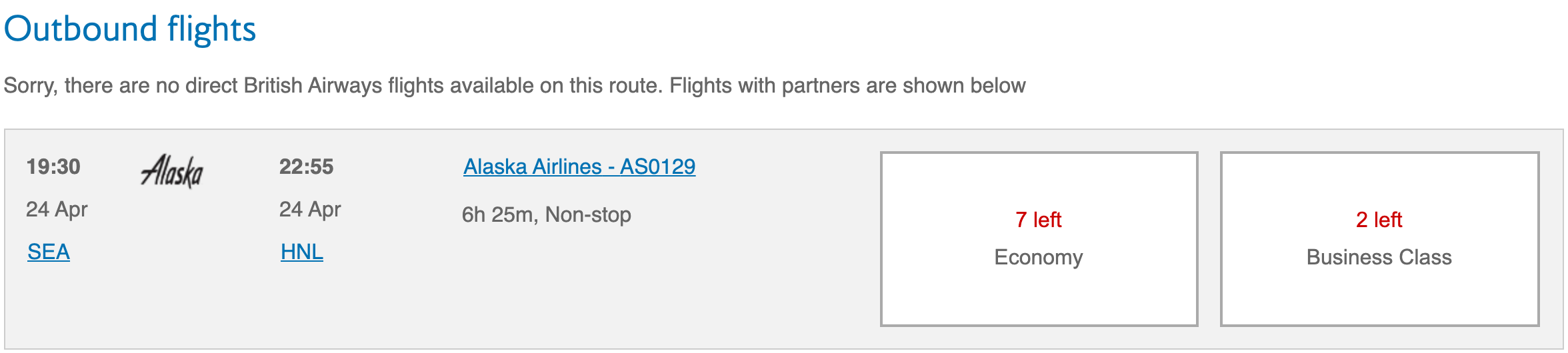 The British Airways Avios search tool is clearly picking up those seats, but only on one of the day’s three flights: