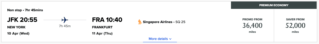 For example, you can fly between New York (JFK) and Frankfurt in either direction for 36,400 KrisFlyer miles in premium economy with Spontaneous Escapes pricing, which is down from the 52,000 miles it would otherwise cost on a “Saver” rate.