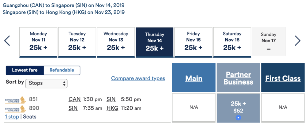 Perhaps even sweeter, though, might be booking a “pseudo-round-trip” as a one-way ticket. Let’s imagine you found yourself in Guangzhou, and wanted to take a side-trip to Singapore: you could book Guangzhou–Singapore–Hong Kong as a “one-way” for 25,000 miles and simply take the high-speed train to close the gap.