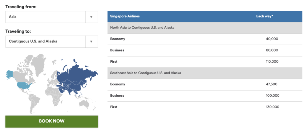 Alaska negotiates independent redemption agreements with each of their partner airlines, so the redemption rates and geographic routing possibilities vary from airline to airline. You can examine the Singapore Airlines award chart on your own at this link – you’ll need to choose the Origin and Destination zones, and then look for a Singapore Airlines chart under the list of charts that shows up.