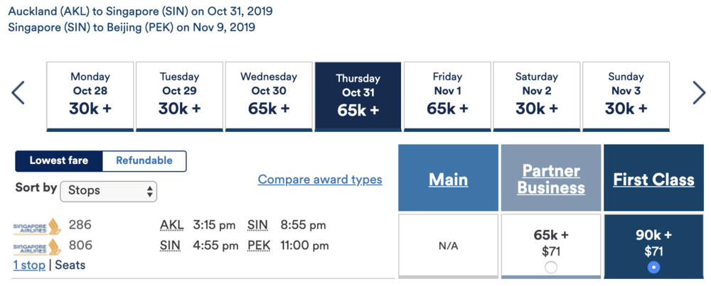 There are a few isolated dates to Auckland as well. These are available at 90,000 Alaska miles in First Class, but you can also add another segment within the South East Asia region, which opens the door to booking something like Auckland–Singapore–Beijing, a 16-hour journey entirely in First and Suites Class, for 90,000 miles!