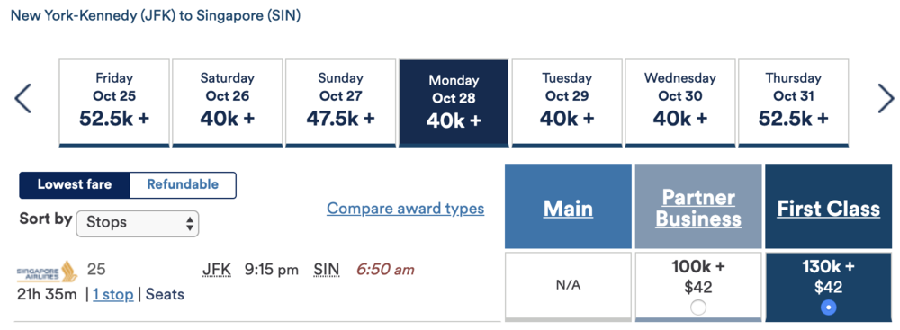 Here’s where things get really exciting. The award space isn’t very plentiful, but if you look hard enough, you can find space in Singapore Airlines First Class and Suites Class!