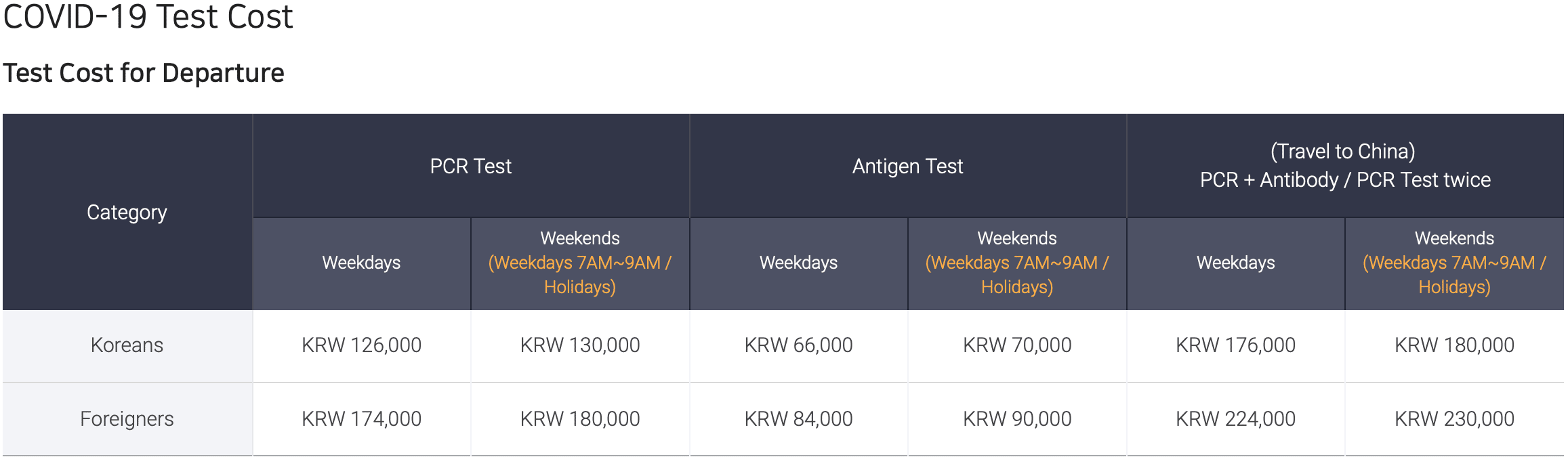 Korean Air offers a list of places to get a test. Seoul Incheon International Airport also does COVID-19 testing on-site, with antigen tests costing ₩84,000–89,000 ($87–93).