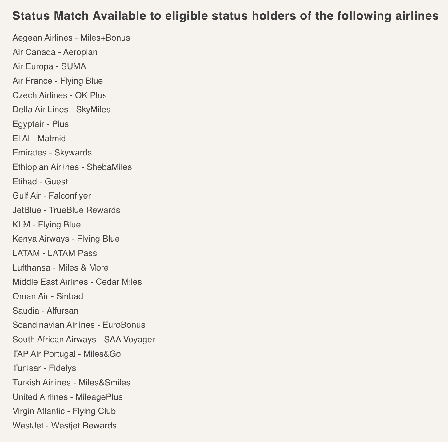 Royal Air Maroc is offering status matches to a very wide range of Star Alliance, SkyTeam, and non-alliance airlines, as listed below:
