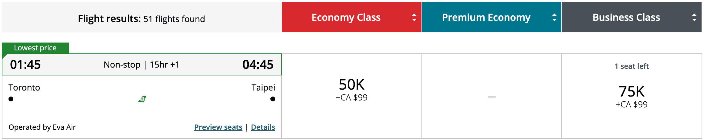From Toronto, 75,000 points is also the price, but only if there’s award space on the direct EVA Air flight. Otherwise, expect to pay 87,500 points for a connecting journey from the East Coast (or any itinerary of 7,500+ miles).