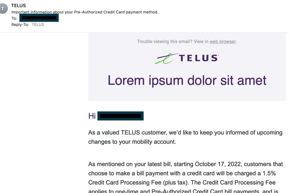 Bad news broke on September 16, 2022, when many Telus customers received an email stating that they’ll be charged a 1.5% service fee for using a credit card to pay their phone bill as of October 17, 2022.