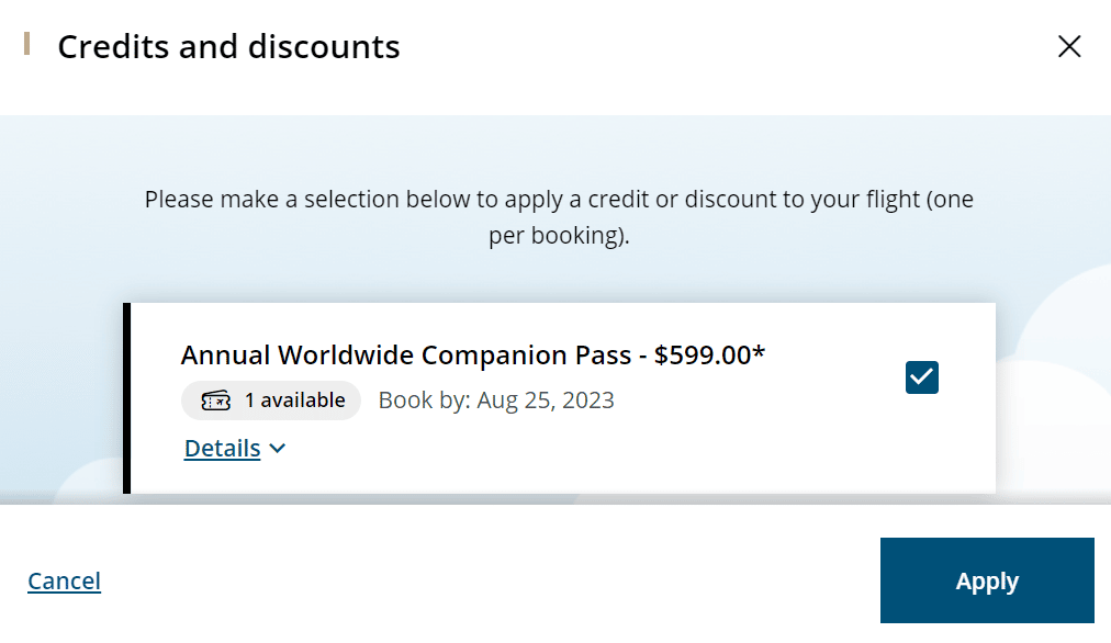 If there are eligible flights for the Companion Pass, you’ll see the base fare clearly marked. Be sure to check off the box next to your Companion Pass, and then click “Apply”.